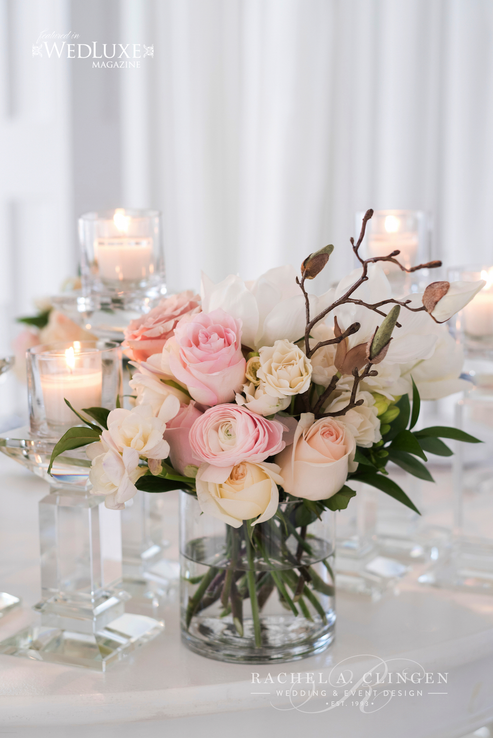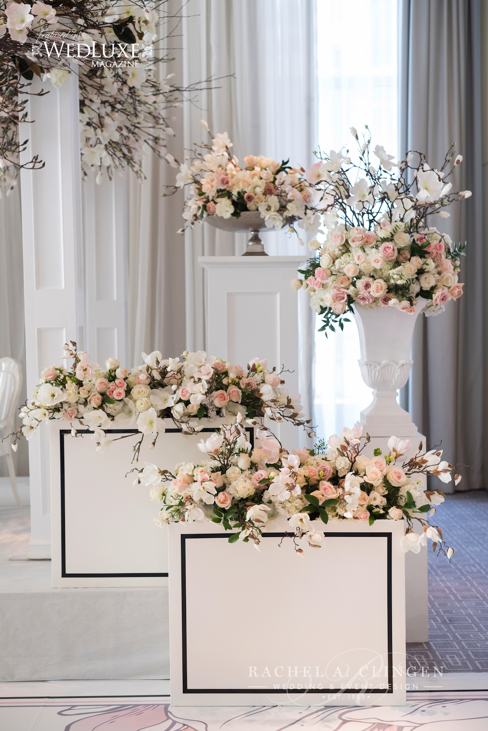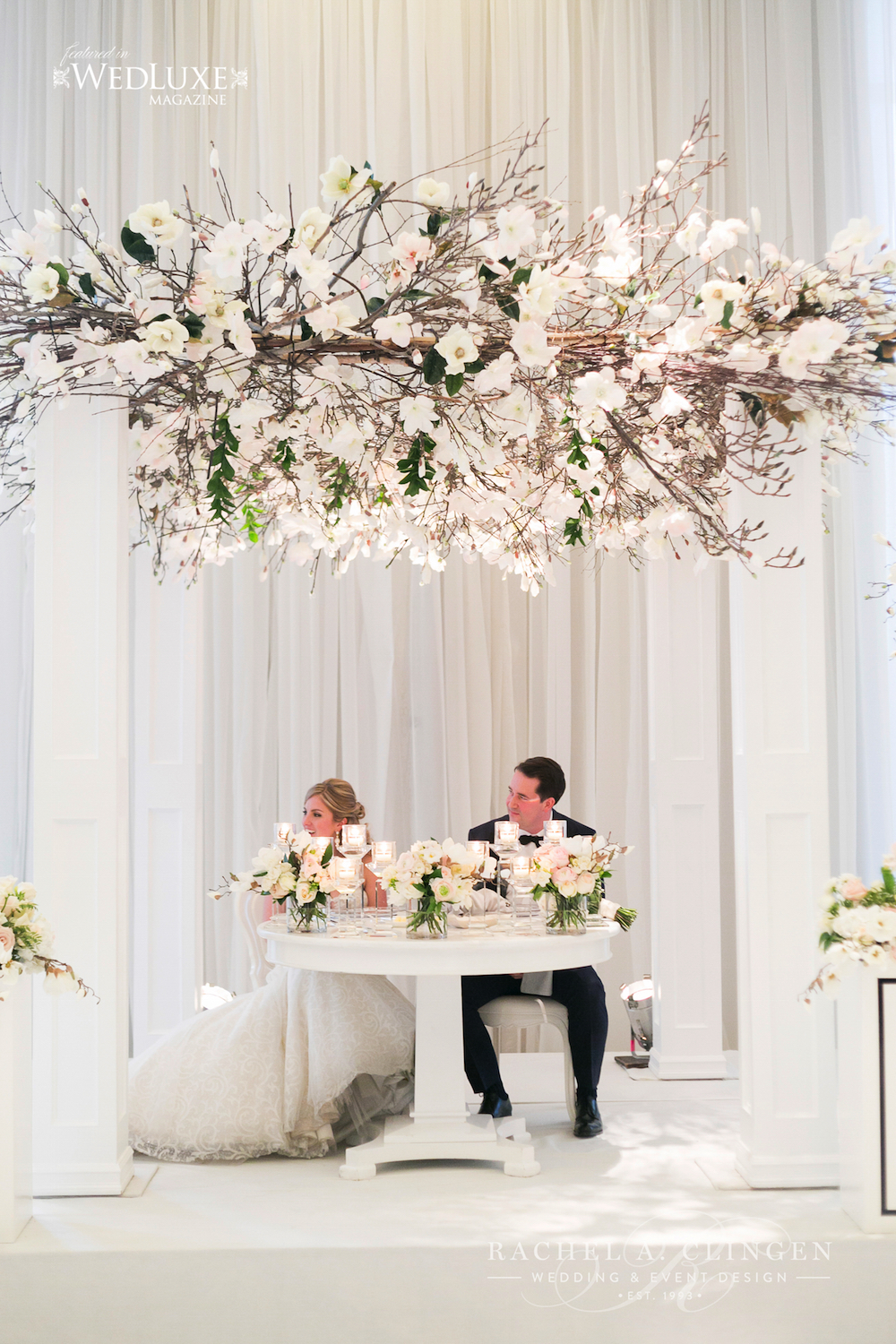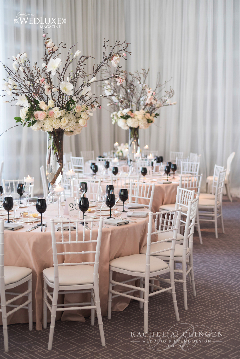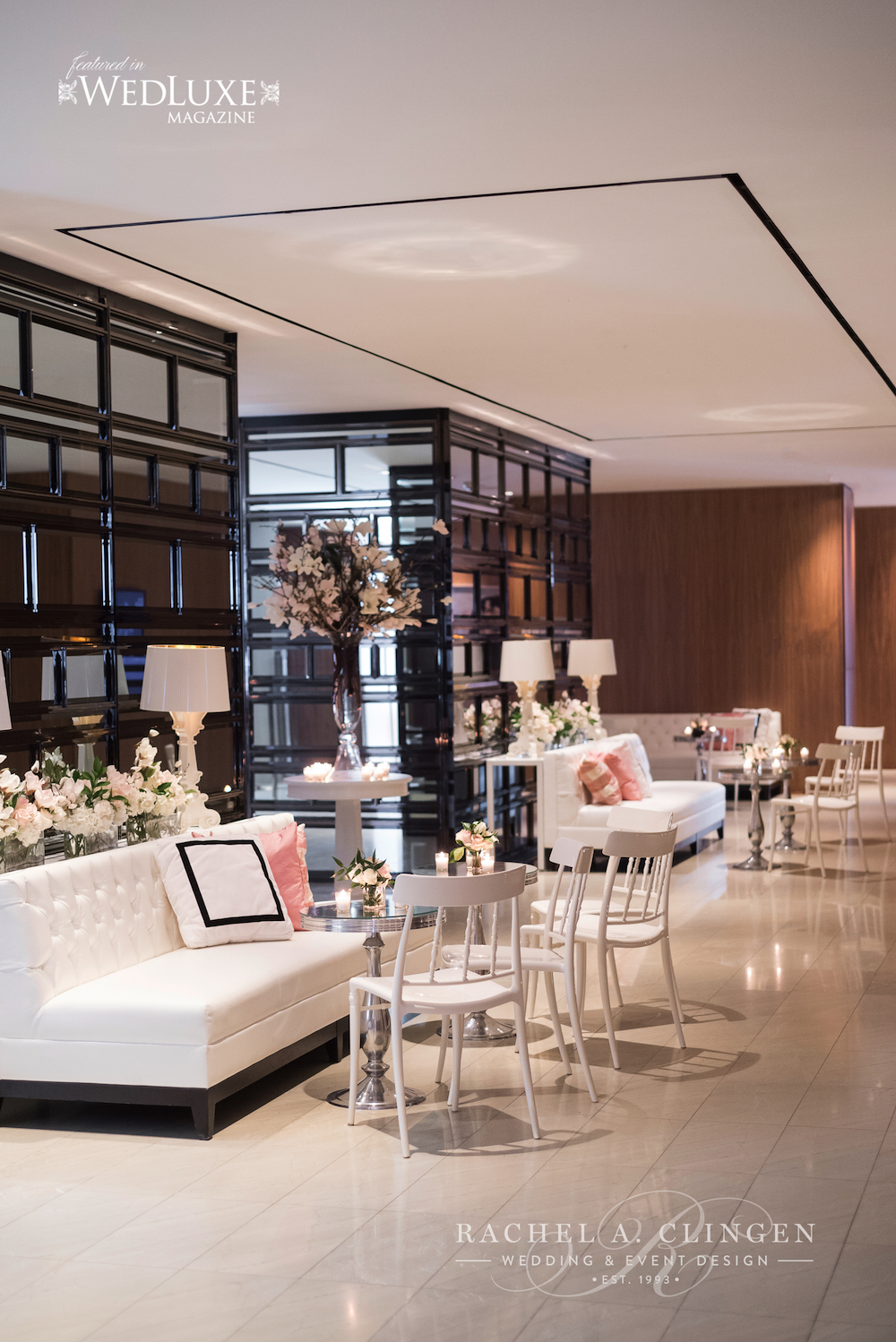 Janelle and Aaron’s spring wedding at the Four Seasons Hotel Toronto, was filled with magnolia blossoms and fresh blooms. After the romantic and traditional wedding ceremony at Grace Church On The Hill, guests were welcomed to a feast for the eyes as well as the palette at the Four Seasons Hotel. The decor and flowers mixed classic elements with modern touches. The beautiful couple dined under a show stopping magnolia canopy created by the team at Rachel A. Clingen. Unique modern accents included black details such as stemware and black pin striping on floral containers. Magnolia branches and fresh blush coloured flowers lined the gallery tables. Spring was in full bloom in the lobby as well. Lounge furniture and magnolias fancied up the lobby at the Four Seasons. Congratulations to Janelle and Aaron. It was such a pleasure working with you. Special thanks to our friends at 5ive 15ifteen for sharing their fabulous images with us and to wedding planner Lisa from Bliss for working so closely with us.