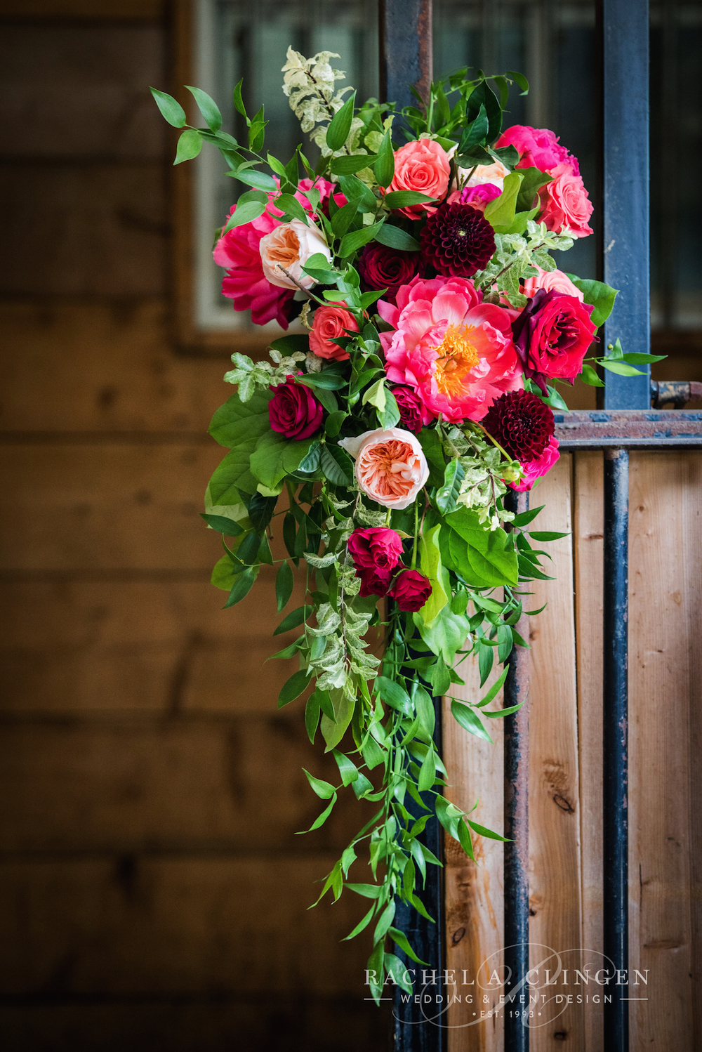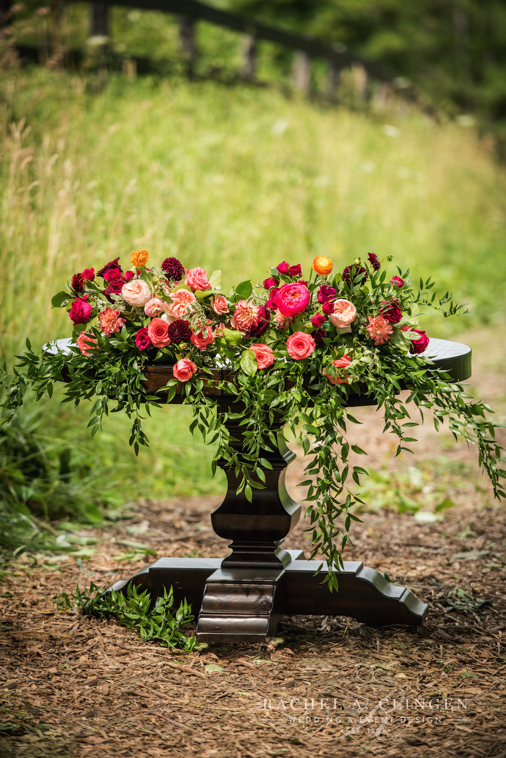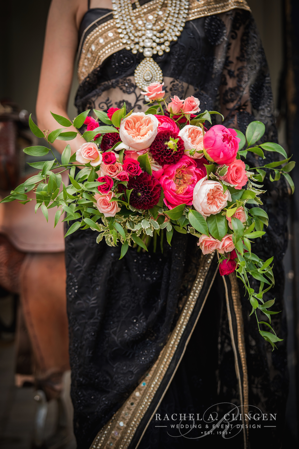 I love the rich colours often associated with Indian and south asian weddings and this gorgeous shoot recently featured in Lavish Dulhan Magazine is no exception. On a very hot summer day, a few of Toronto’s leading vendors collaborated to execute this beautiful wedding creative loaded with brilliant jewelled toned, colourful flowers and decor. A blend of rustic elements and luxurious details set the stage for our beautiful harvest table and ceremony, while the country side setting and natural elements were the perfect canvas for this backyard affair. We designed a spectacular floral arch with local foliage, branches and gorgeous fresh flowers. I often love to work with an ‘un-thought of’, ‘pop of colour’ separate from the initial palette and this time, black details such as the water goblets and saree added a visual twist. I was inspired by the harshness of the black fence amongst the more neutral tones of the summer grasses, fields and trees carried this colour throughout the shoot.