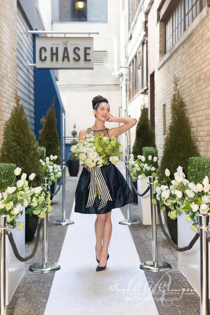 Its finally time to share with you our beautiful chic ‘bridal shower’ creative shoot at the beautiful The Chase Restaurant in downtown Toronto. Together for a fun and creative day, our elite wedding vendor team drew its inspiration from the world of Rachel Zoe – the ever-quotable fashion stylist, editor, and author renowned for her effortless take on glamour. I love the fresh and modern palette of green viburnum flowers, navy, and ivory. The the fashionable and chic stripes found in the beautiful architecture of The Chase inspired us in the different elements of the shoot. Our flowers and decor were a display tailor-made for a luxe bride-to-be. As Rachel Zoe says, “Style is a way to say who you are without having to speak.” We worked closely with Toronto wedding planner Laura from Laura & Co. Events, to co-produce this incredible assignment. Incredible photography by our friends at 5ive15ifteen.