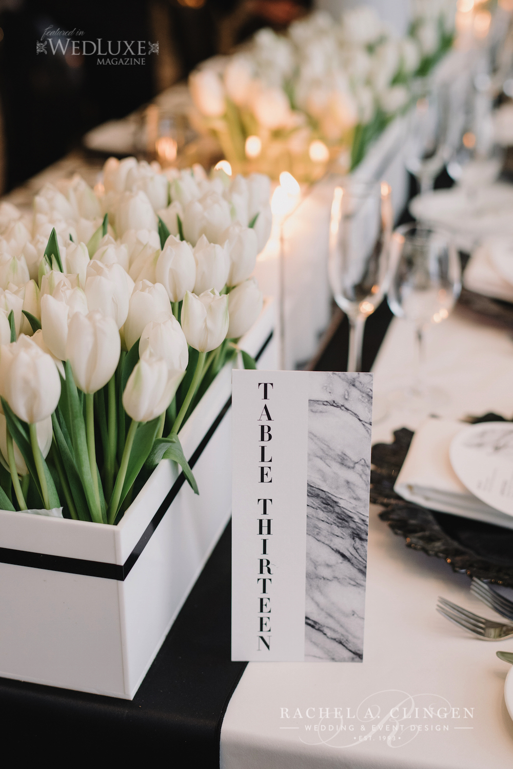 Veronica and Craigs modern black and white wedding at One King West in Toronto took modern chic to a whole new level. Jessy loved working with beautiful Veronica and collaborated closely her to design her downtown dream wedding. Our team created the glamorous look with rows of white tulips and stunning white cherry blossoms both at the Metropolitan Church ceremony and the reception. Sleekness and sophistication was everywhere the eye could see. Both the ceremony and reception showcased modern containers of cherry blossoms and white tulips. Clear lucite boxes with rows of white candles and white plexi boxes filled with white tulips lined the gallery guest tables. Featured in the pages of Wedluxe magazine, Craig and Veronica’s wedding is certainly one for the books.