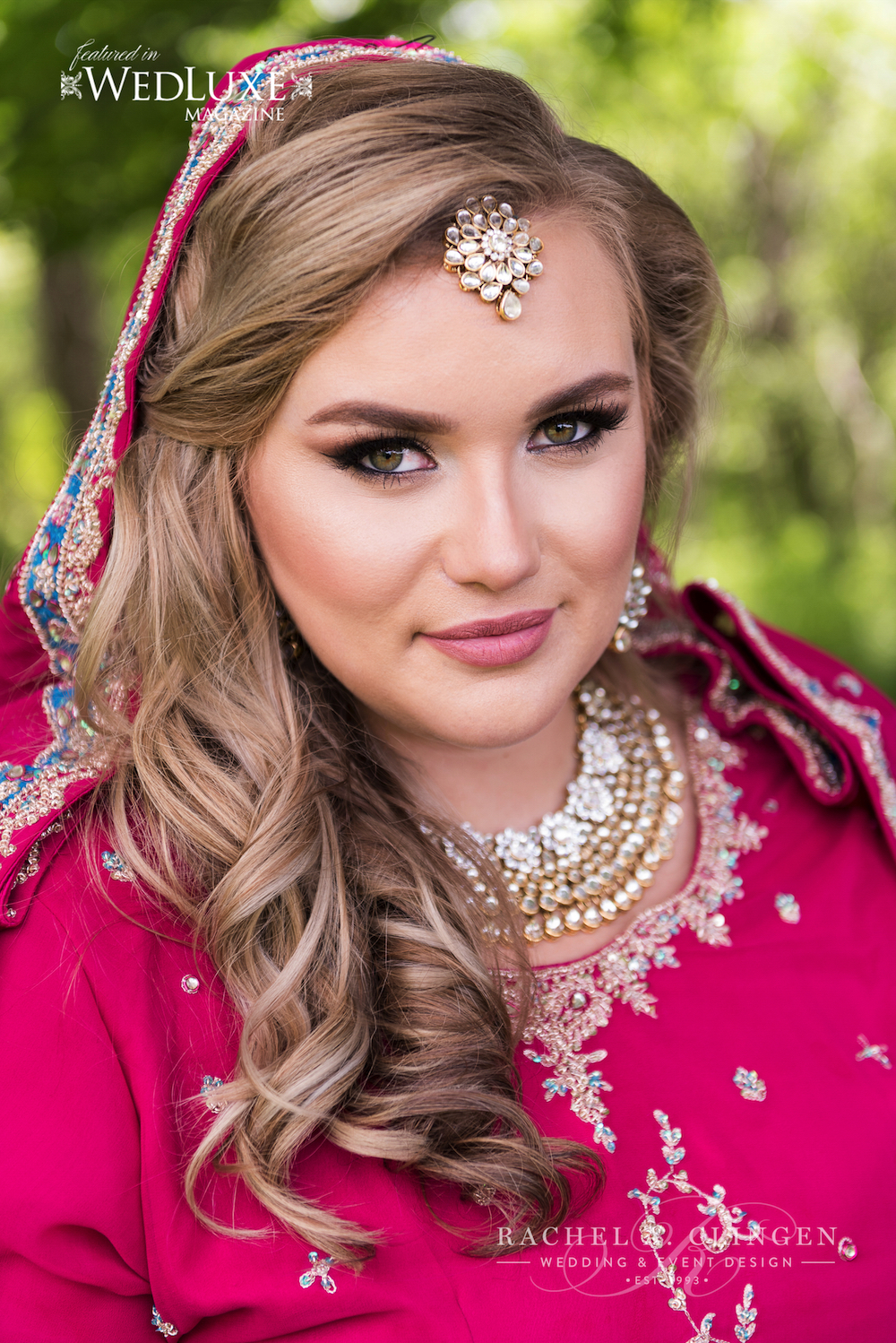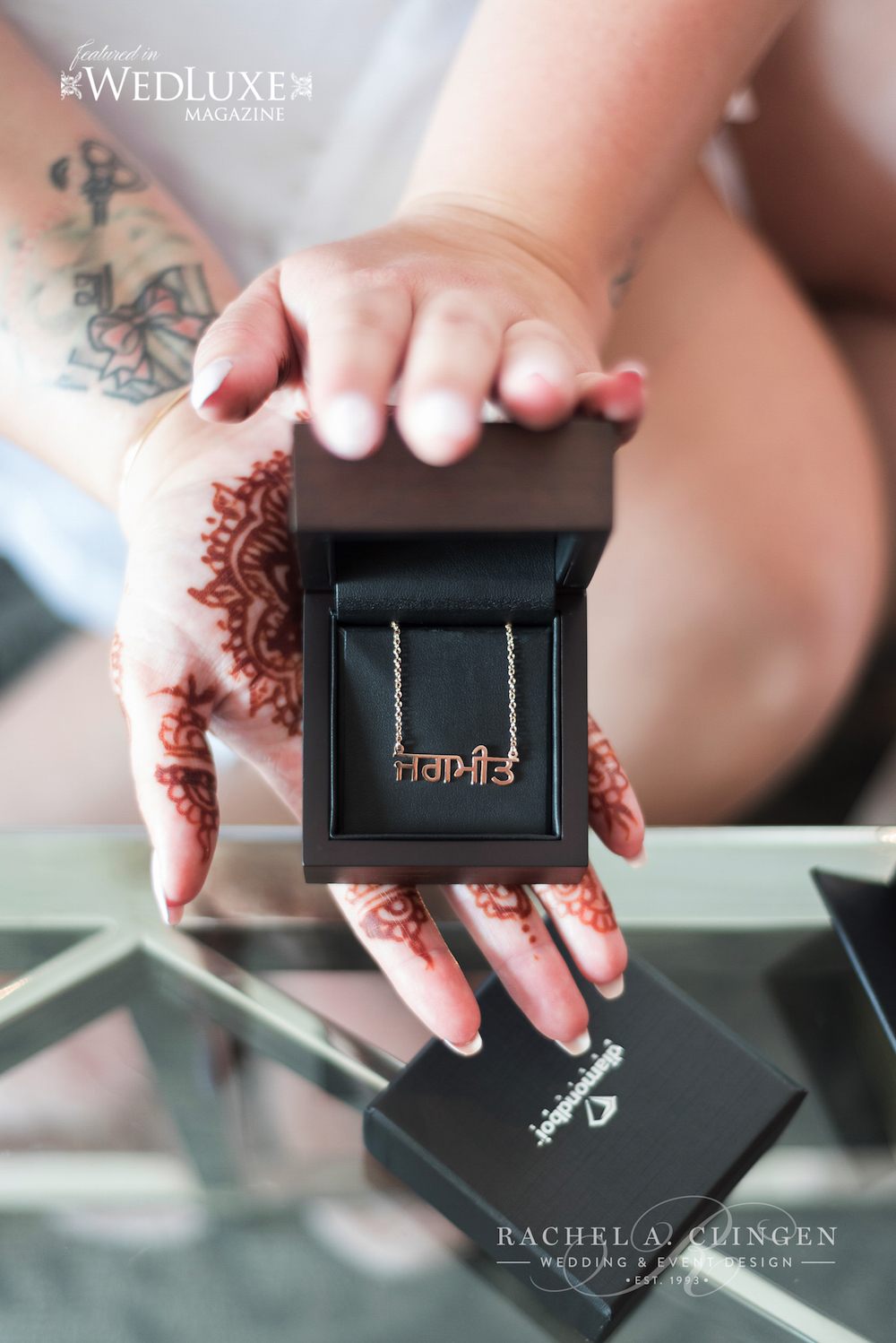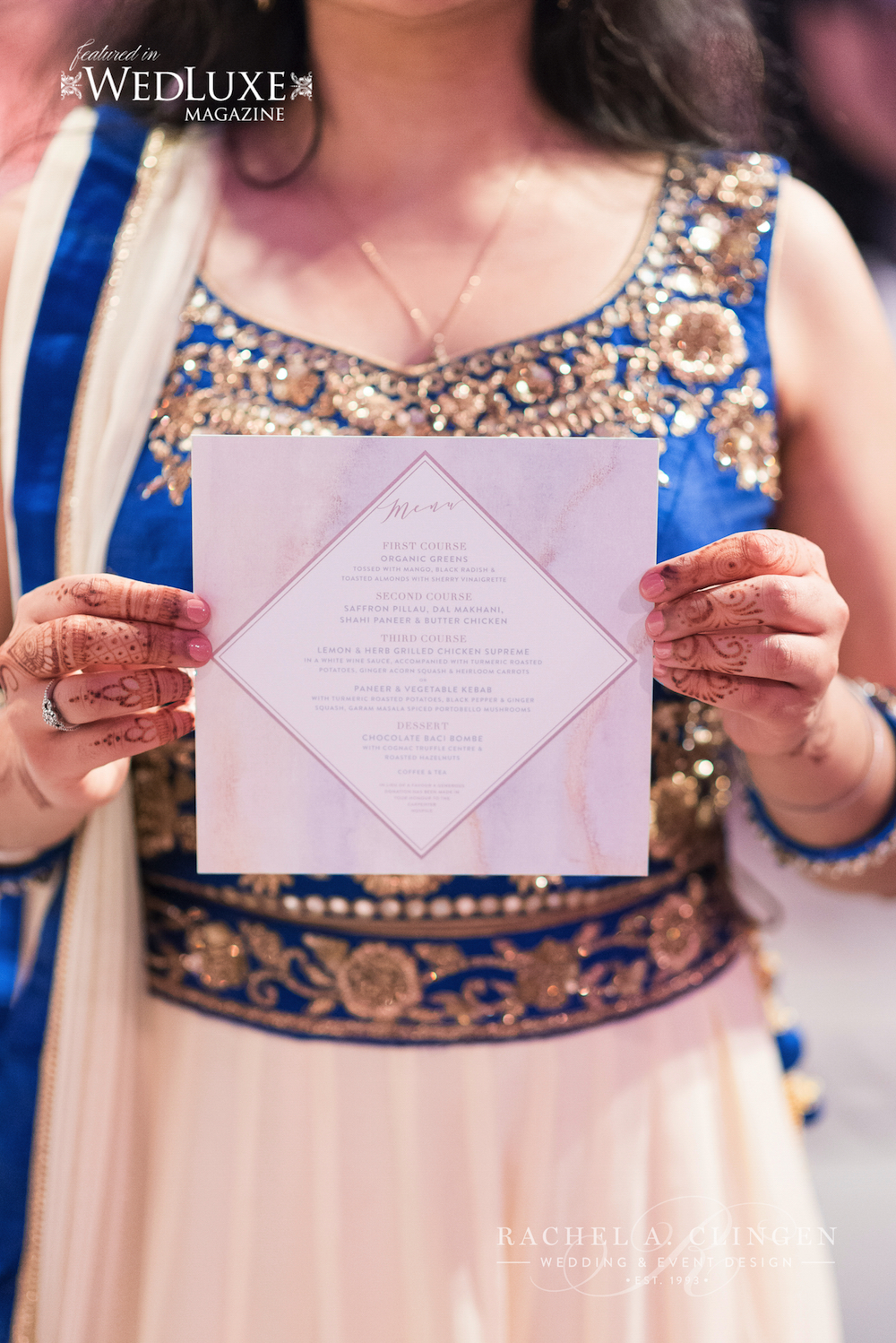 photography – 5ive15ifteen Photo Company, planning – Laura & Co. Events, floral and decor design – NAPKINS • Rachel A. Clingen Wedding & Event Design, stationery – Paper & Poste, venue – Liberty Grand Entertainment Complex, gown – Hayley Paige from Kleinfeld Hudson’s Bay, veil – Malis-Henderson from Kleinfeld Hudson’s Bay, shoes – Rene Caovilla, clutch – BCBG Max Azria, wedding rings – The Diamond Studio Inc., bracelet and earrings – The Urban Shoe Myth, brides lengha and grooms sherwani • Raja Fabrics, hair and make up – Bene Pham, bridesmaids – Sorella Vita from Promises & Lace, grooms formalwear – King & Bay, grooms cufflinks – Tiffany & Co., grooms shoes – Loding, rose gold flatware – FOS Decor, place card holders – BHLDN, jade charger plates – Detailz Couture Event Rentals, blue charger plates – Plate Occasions, blush head table details – Anthropologie, linens – Around The Table, cake design – Fine Cakes by Zehra, entertainment – Michael Coombs Entertainment, aisle runner and bar decals – Event Graffiti, av – EMD Event Media Design, transportion – Luxe Drive
