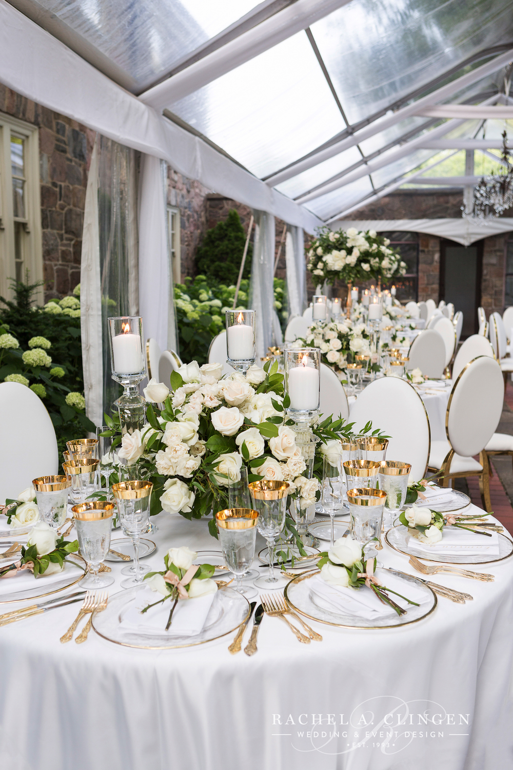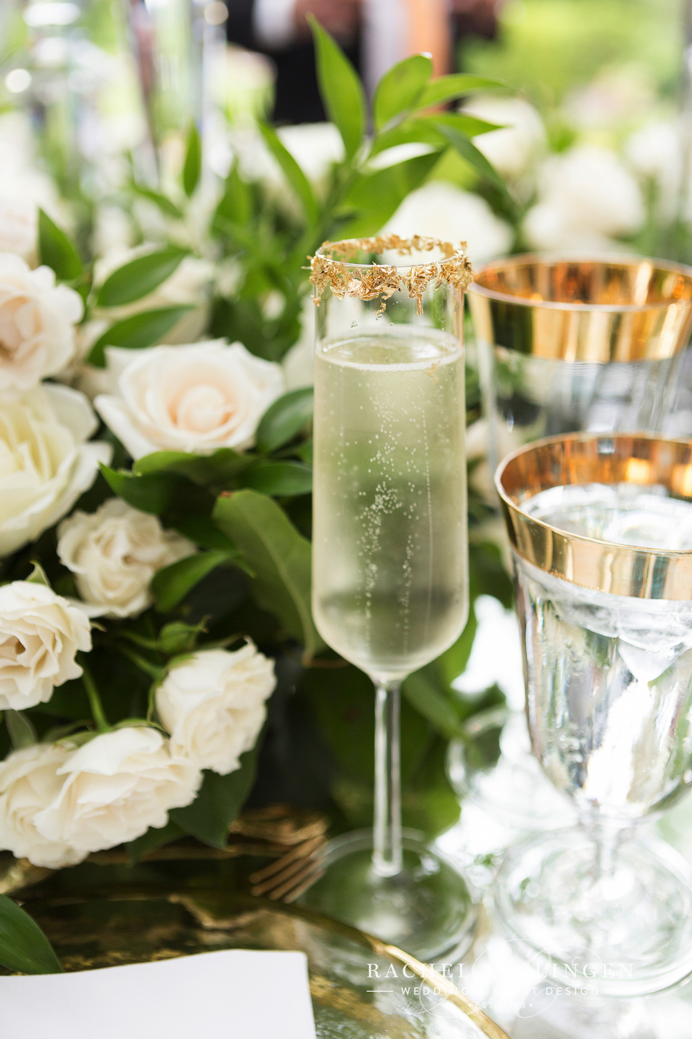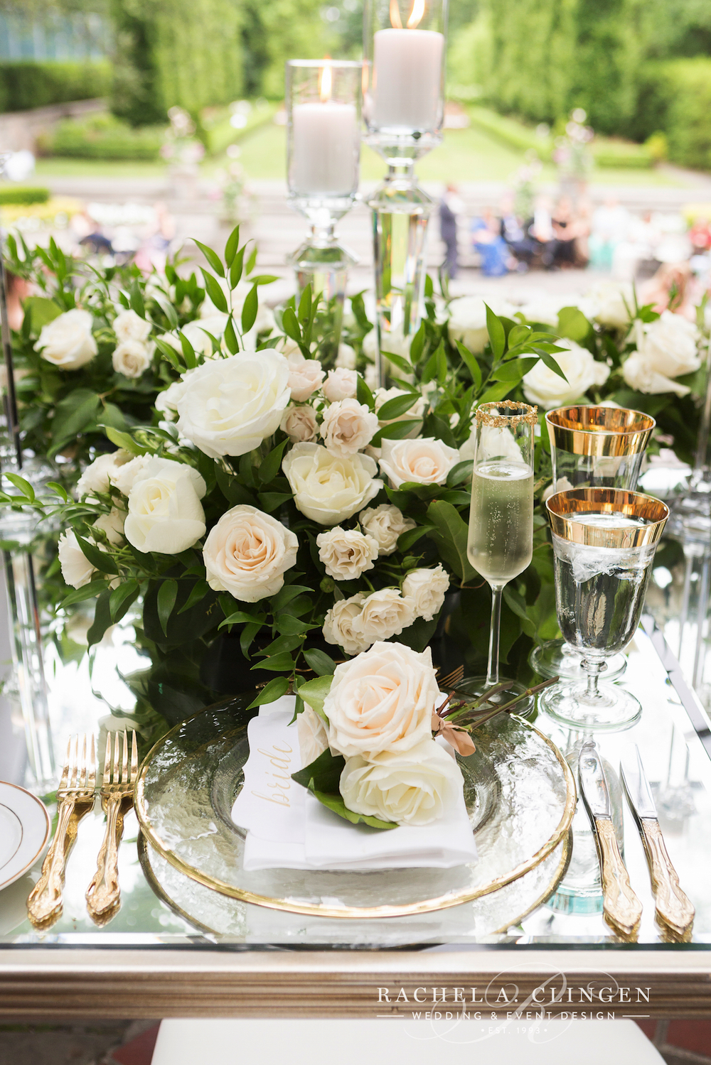 Luxurious decor elements included crystal candle sticks, gold cutlery and gold rimmed stemware. Shady and John dined at a beautiful mirrored table just for two. Shady thought of eery detail, including, hand tied flowers for every guest! Now thats a garden wedding to remember!