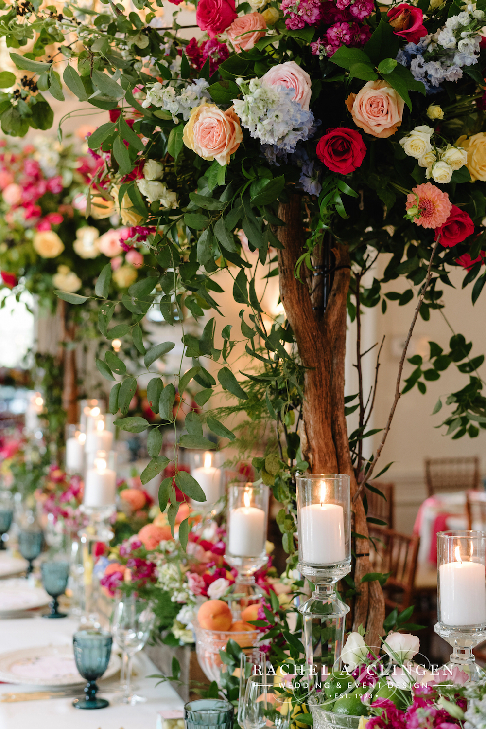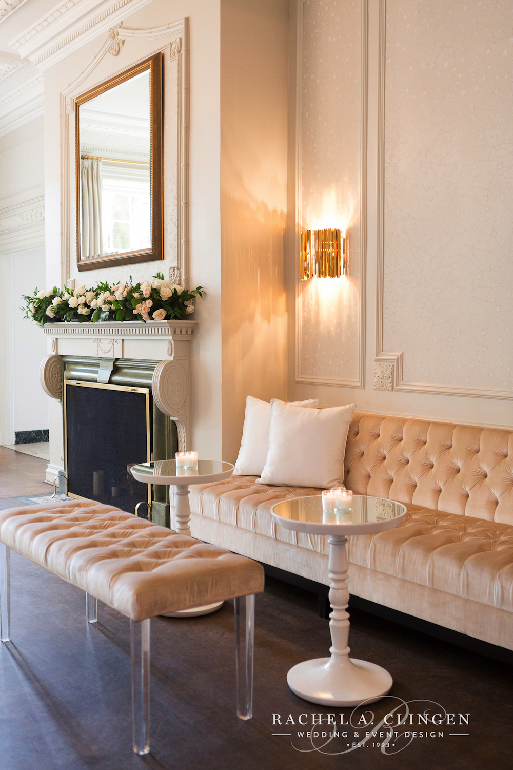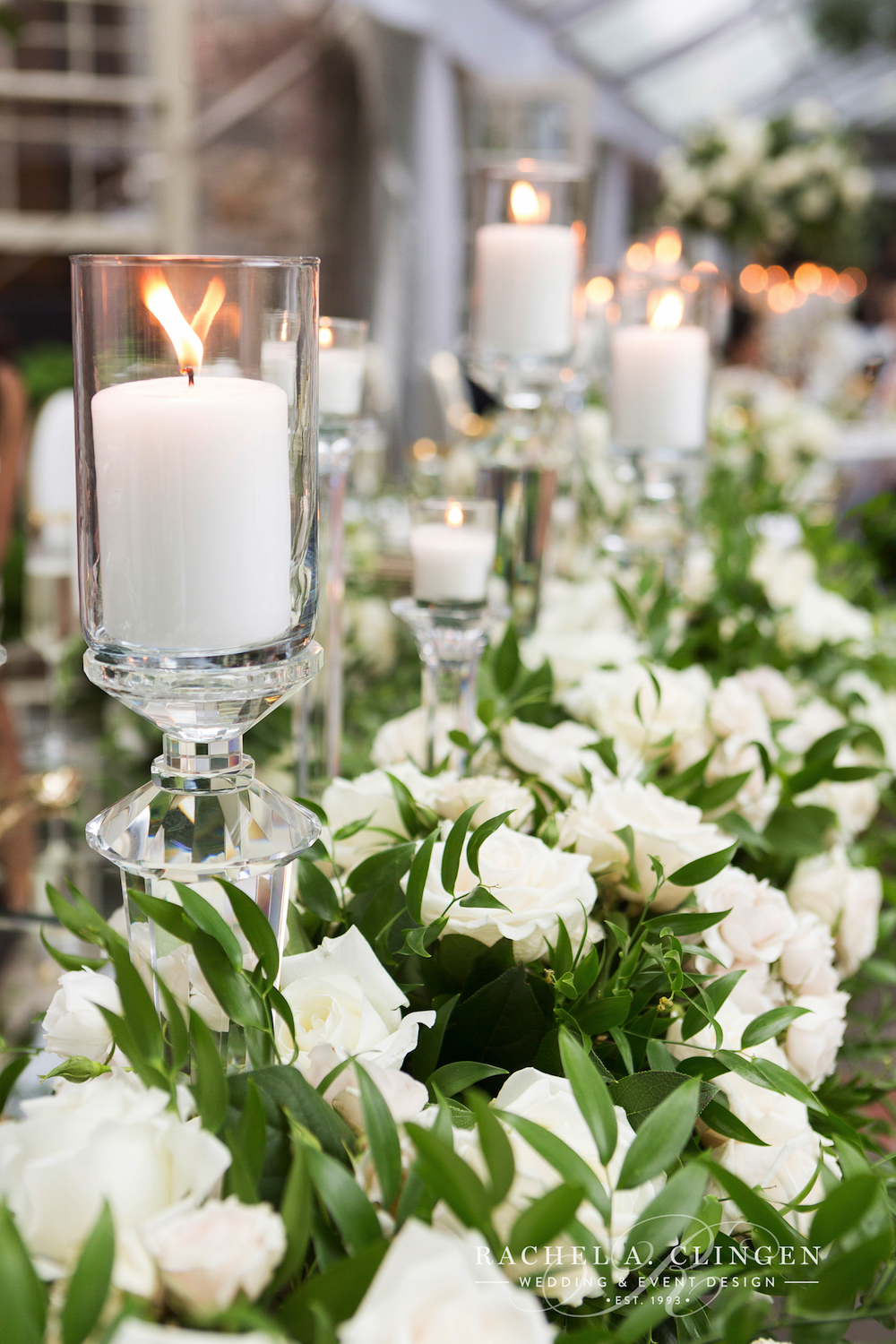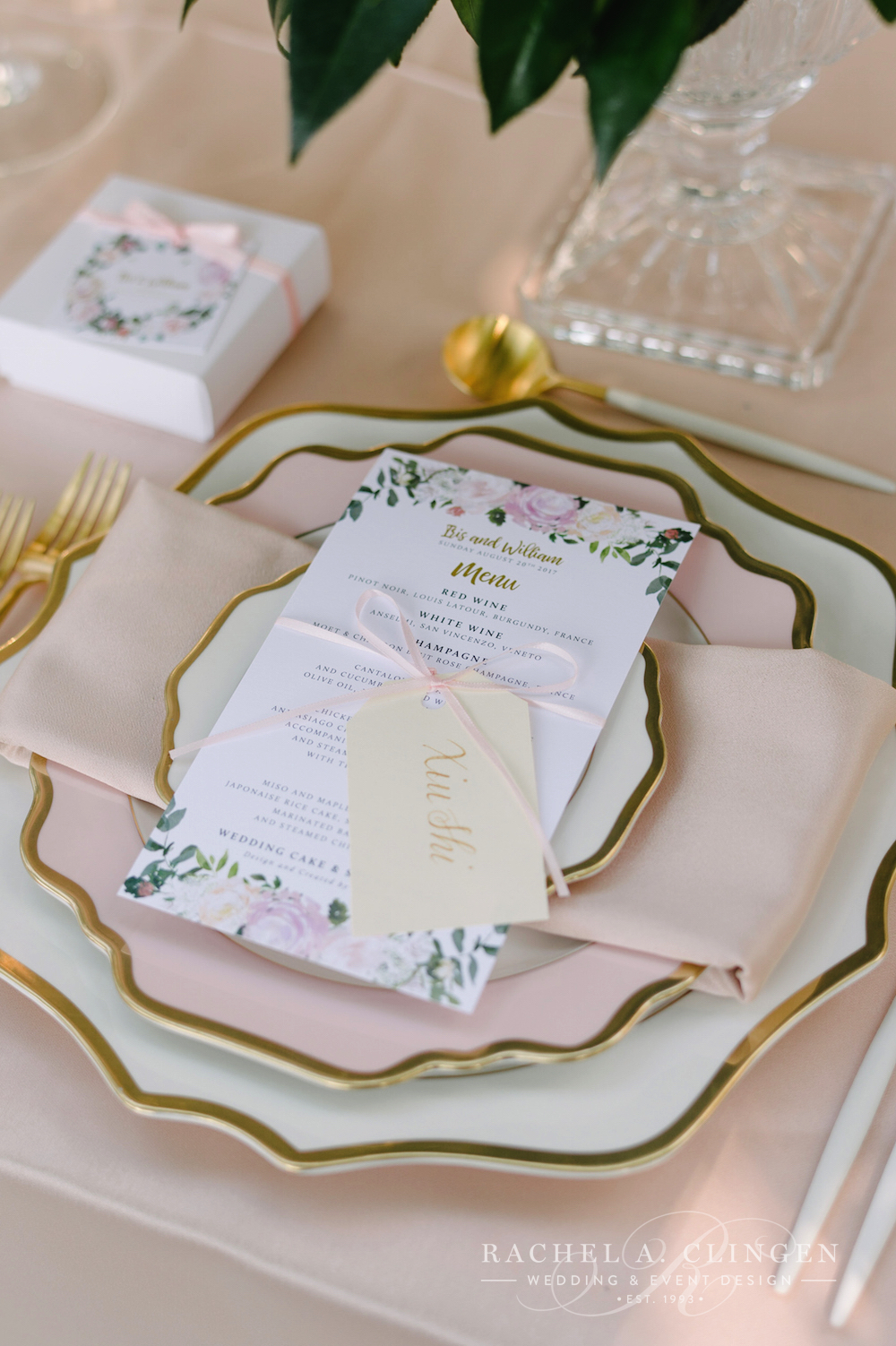 Luxurious decor elements included crystal candle sticks, gold cutlery and gold rimmed stemware. Shady and John dined at a beautiful mirrored table just for two. Shady thought of eery detail, including, hand tied flowers for every guest! Now thats a garden wedding to remember!