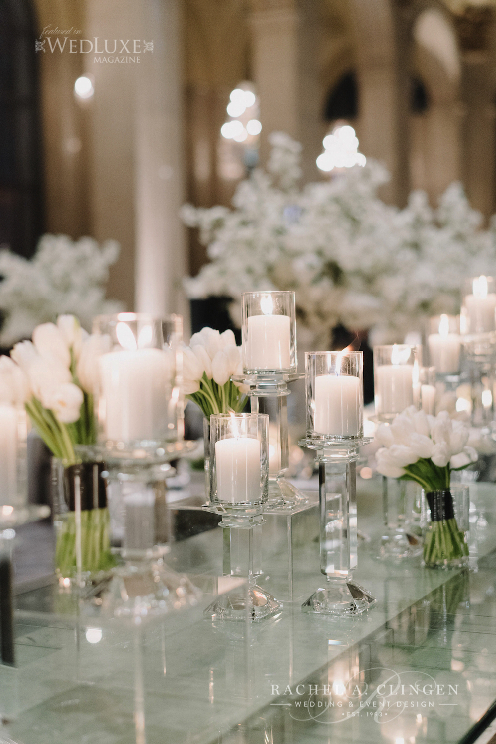 Veronica and Craigs modern black and white wedding at One King West in Toronto took modern chic to a whole new level. Jessy loved working with beautiful Veronica and collaborated closely her to design her downtown dream wedding. Our team created the glamorous look with rows of white tulips and stunning white cherry blossoms both at the Metropolitan Church ceremony and the reception. Sleekness and sophistication was everywhere the eye could see. Both the ceremony and reception showcased modern containers of cherry blossoms and white tulips. Clear lucite boxes with rows of white candles and white plexi boxes filled with white tulips lined the gallery guest tables. Featured in the pages of Wedluxe magazine, Craig and Veronica’s wedding is certainly one for the books.