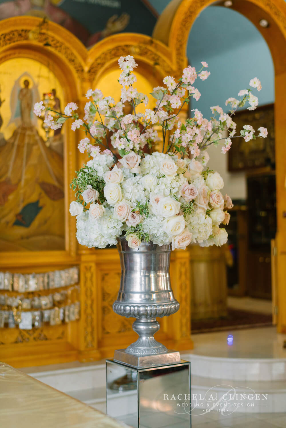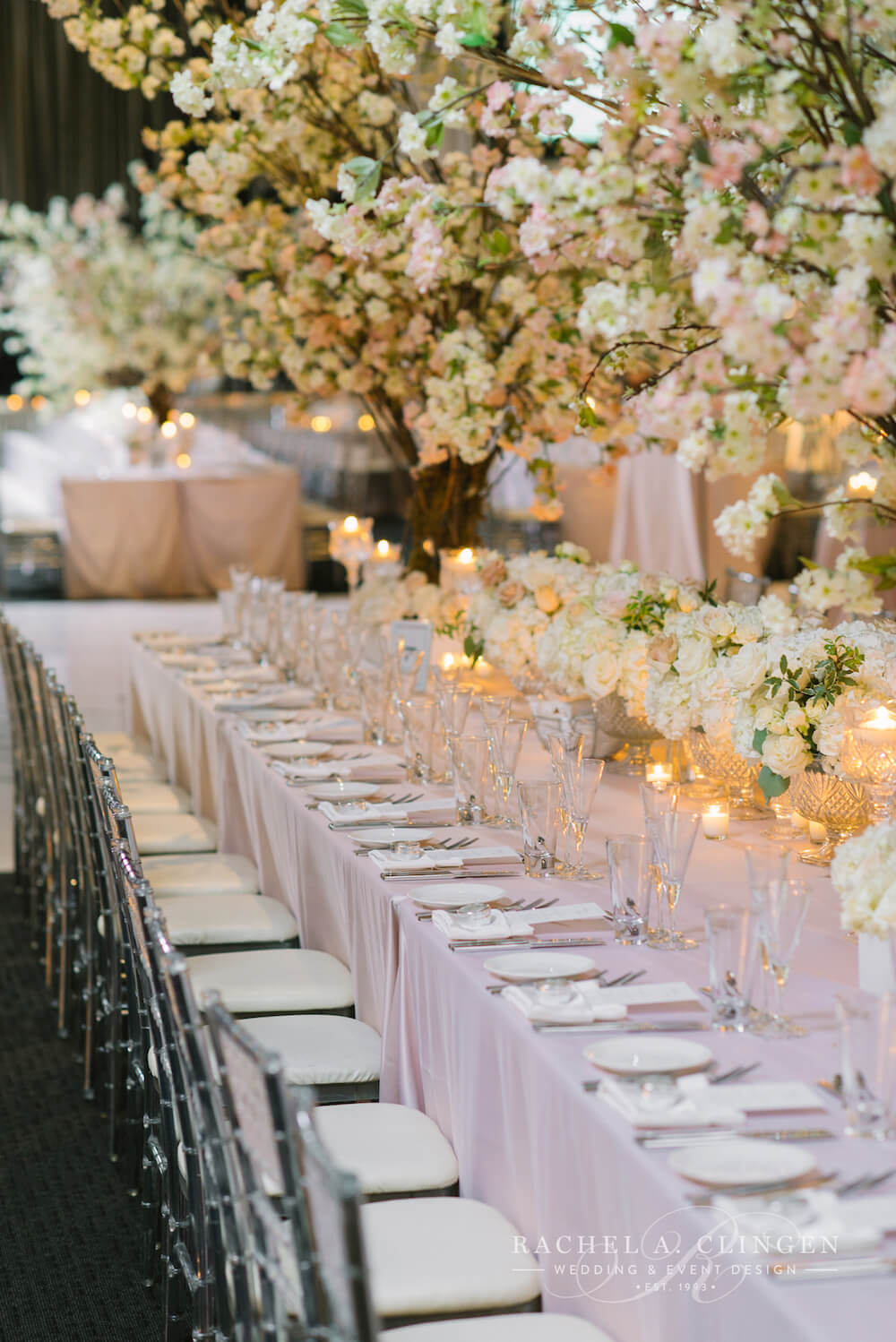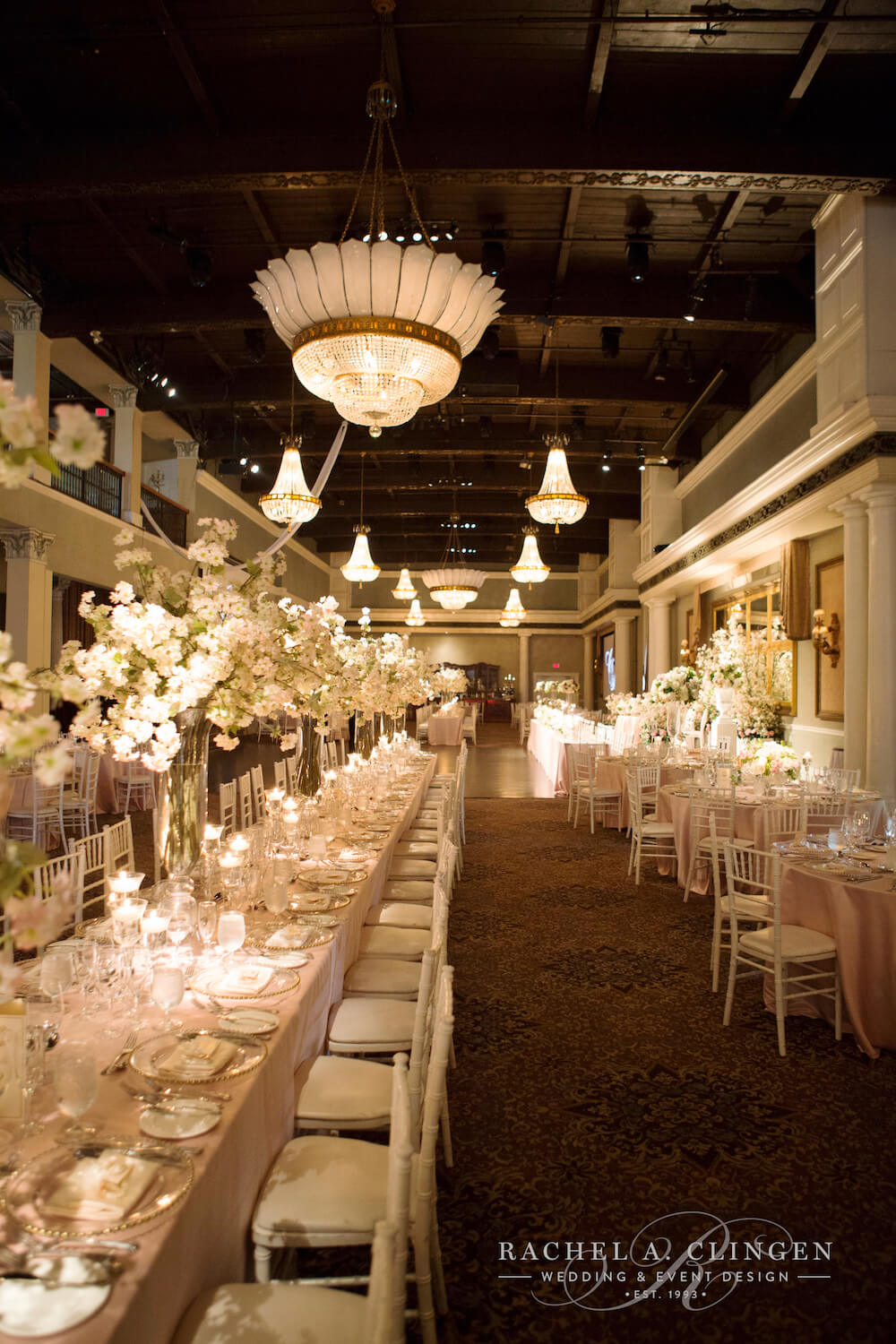 Last spring, we created something magical at the Grand Luxe for Matina and Victor. Metamorphosis Greek church in Toronto was decorated with cherry blossoms which lined the aisle. The historical church’s beautiful architecture created a stunning back drop for the display of spring blooms. As guests arrived for cocktail hour to the foyer at the Grand Luxe, they mingled under our custom ceiling high cherry blossom tree. Life size table top cherry blossom trees were also created for the gallery guest tables and were definitely show stoppers for the couples guest. The stunning decor was soft and elegant and added the freshness of spring to the main room at the Grand Luxe. Matina and Victor dined in an intimate yet grand custom canopy created with silk blush fabric which matched the linens. Our classic cut crystal candelabras and coordinating candle stands added to the romantic and sophisticated look. Such a pleasure to work with this lovely couple. Thank you to Mango Studios for sharing your beautiful images with us!